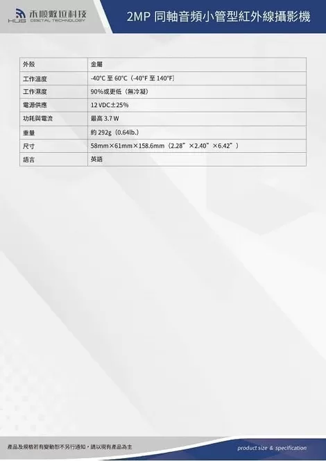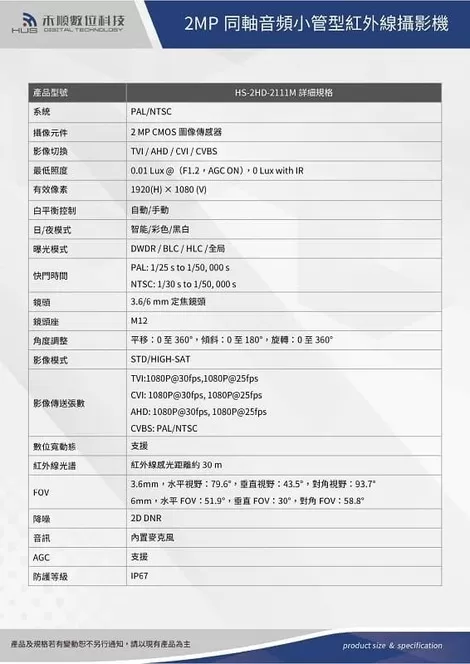 200萬畫素同軸音頻小管型紅外線攝影機(HS-2HD-2111M)