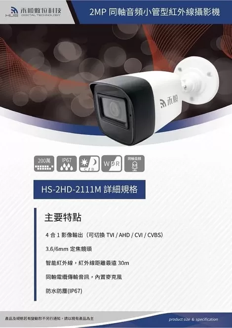200萬畫素同軸音頻小管型紅外線攝影機(HS-2HD-2111M)