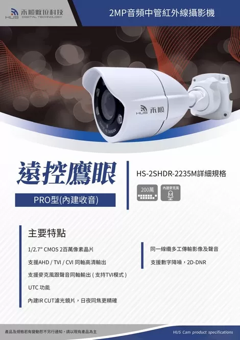 1/2.7”CMOS 2百萬像素晶片支援AHD/TVI/CVI同軸高清輸出支援麥克風跟聲音同軸輸出(支持TVI模式)UTC功能內建IR CUT濾光鏡片,日夜同焦更精確同一線纜多工傳輸影像及聲音支援數字降噪 ,2D-DNR