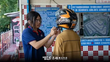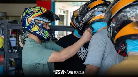 工作人員協助將全罩安全帽的雙D扣調整至舒適的鬆緊度