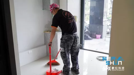 工程師說大理石牆面這邊要貼壓條、等等要先做擦拭上面灰塵較多