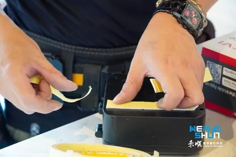 再來工程師拿出泡棉膠????貼在監視器防水盒上面?